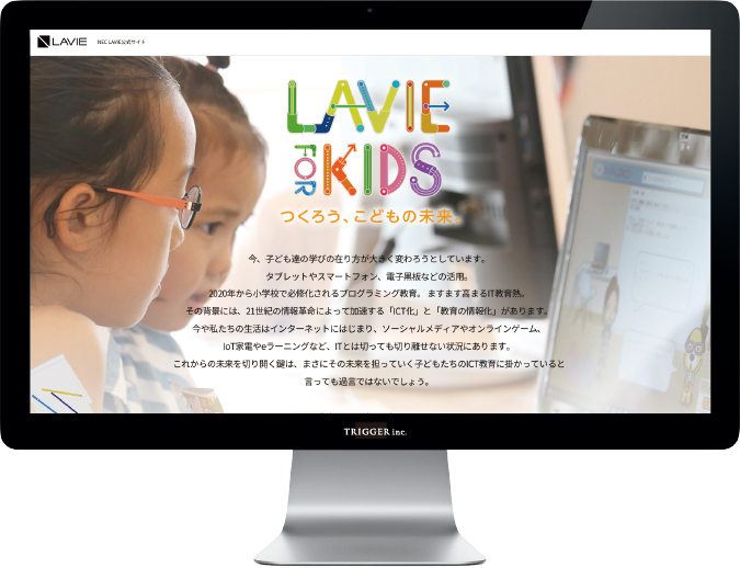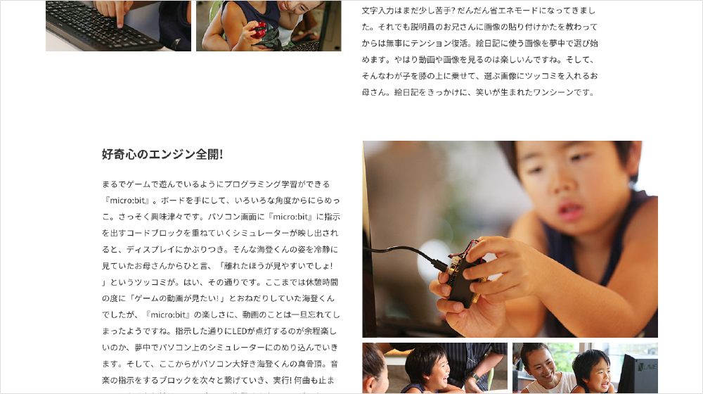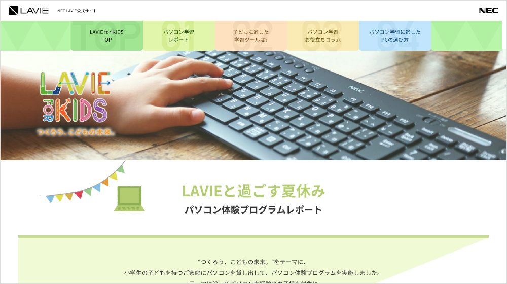 ワークショップの様子は特設のWebサイトでレポート。真剣にPCへ向き合う子どもたちの写真をふんだんに使用し、小学生の子どもを持つ親へ、製品の魅力をアプローチする仕立てとした。