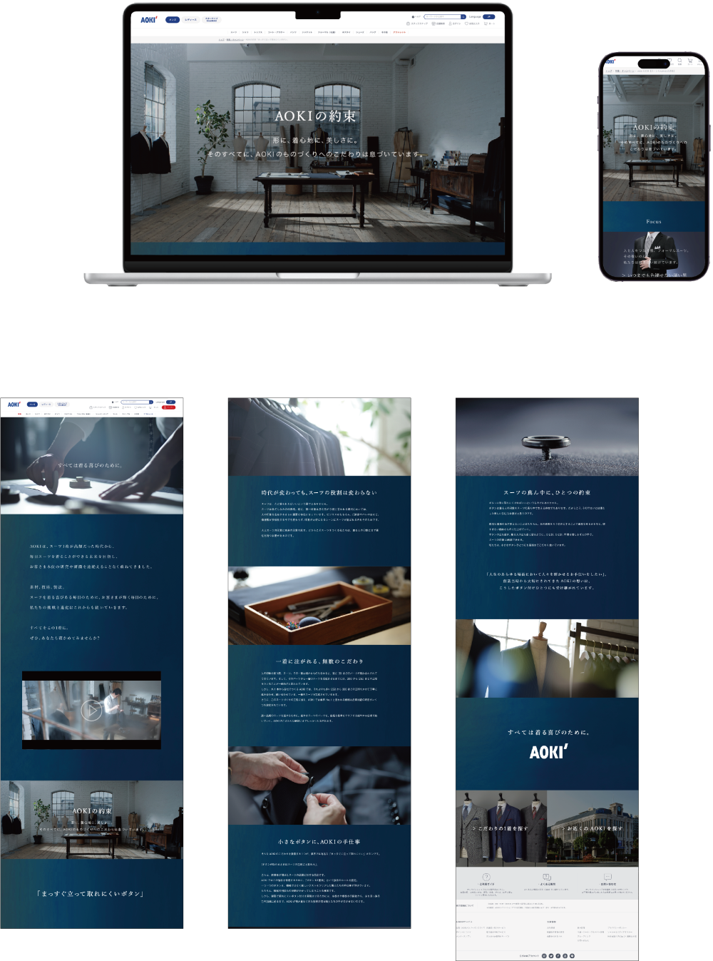 年間を通してスーツを象徴する各要素にそれぞれフォーカス。そこに込められているAOKIの品質に対する裏付けとブランドとしての想いを、動画と、詳細に迫る記事との組み合わせで継続的にアプローチした。